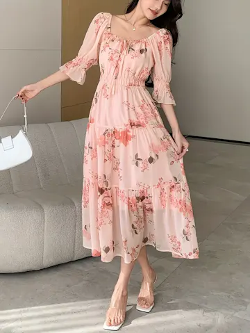 Square Neck Midi Dress, Lightweight Polyester Elegant Floral Print Square Neck Midi Dress for Women - Ruffled Sleeves, Flowy Design, Perfect for Summer Casual Wear, Cute Dress.