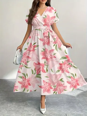 Elegant Pink Dress, Lightweight Polyester Elegant Pink Floral Print Maxi Dress for Women | V-Neck, A-Line Silhouette, Waist Belt, Perfect for Casual or Beach Outings.